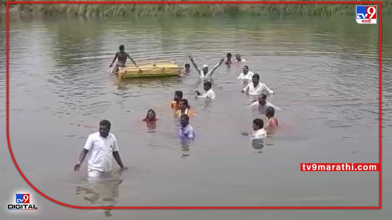 नांदेड : यंदाच्या (Kharif Season) खरीप हंगामातील नुकसानभरपाई देण्यास पीकविमा कंपन्यांनी टाळाटाळ केली होती. त्याच दरम्यान, राज्याचे कृषिमंत्री दादा भुसे यांनी (Insurance Company) विमा कंपन्यांच्या अशा या धोरणामुळे शेतकरी रस्त्यावर उतारल्याशिवाय राहणार नाही. त्यामुळे केंद्राचा या विमा कंपन्यांवर अंकुश असणे गरजेचे असल्याचे सांगितले होते. तीन महिन्यापूर्वी त्यांनी हे भाकीत केले असले तरी त्याची प्रचिती (Nanded) नांदेडमध्ये आली आहे. रखडलेल्या पीक विम्याची मागणी करीत हादगाव येथील शेतकऱ्यांनी थेट जलसमाधी आंदोलन केले आहे. तालुक्यातील नदीकाठच्या आठ गावातील शेतकऱ्यांनी आंदोलन करीत सन 2021- 22 मधील नुकसानीचा उर्वरित पीक विमा आणि 2020 चा जाहीर केलेला विमा तात्काळ देण्याची मागणी केली आहे.