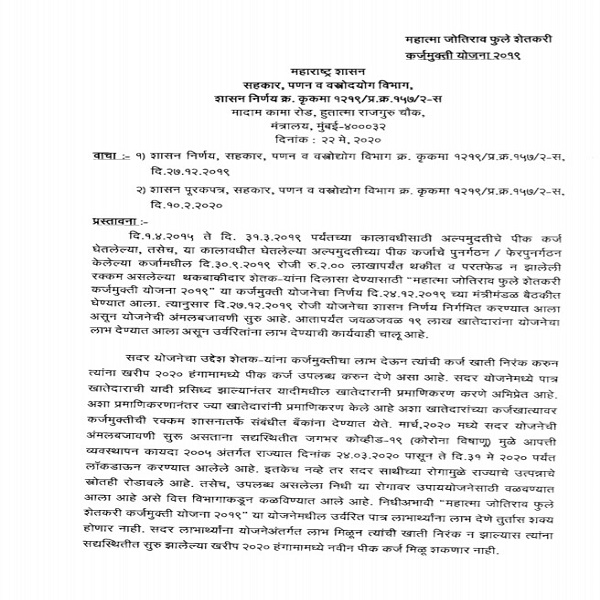 राज्य सरकारने शेतकऱ्यांना दिलासा देण्याकरिता महात्मा ज्योतिराव फुले कर्जमाफी योजनेची घोषणा केली. शेतकऱ्यांना कर्जमाफीचा लाभ देण्यास सुरुवात झाली. मात्र कोरोनाच्या संकटामुळे बहुतांश शेतकऱ्यांच्या खात्यात रक्कम जमा करण्यात आली नव्हती. शासनाने जाहीर केलेल्या कर्जमाफीच्या यादीत नाव आहे, पण, लाभ मिळाला नाही. परिणामी सातबारावर कर्जाचा उल्लेख आहे. यामुळे बँकांकडून अशा शेतकऱ्यांना पीककर्ज नाकारण्यात आले. अशा शेतकऱ्यांचे कर्ज शासनजमा असल्याचा उल्लेख करुन त्यांना कर्ज देण्याचे आदेश शासनाने काढून खरीप हंगामाच्या तोंडावर शेतकऱ्यांना दिलासा दिला आहे.