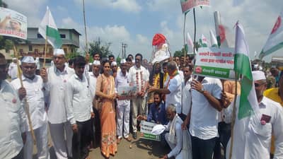मनोहर शेवाळे, प्रतिनिधी, टीव्ही 9 मराठी, मालेगाव : कांद्याची पंढरी (Onion) म्हणून ओळख असलेल्या नाशिक (Nashik) जिल्ह्यातील कांदा उत्पादक शेतकरी (Farmer) चिंतेत सापडला आहे. सातत्याने कांद्याच्या बाजारभावात घसरण आणि केंद्राच्या निर्यात विषयक धरसोडीच्या धोरणावरून शेतकरी संकटात सापडला आहे. याच मुद्द्यावरून शेतकरी वर्गात मोठी नाराजी पसरली असून कांद्याच्या दराबाबत योग्य धोरण ठरवा अशी मागणी केली जात आहे. कांदा उत्पादक शेतकऱ्यांच्या नाराजीचा धागा पकडत शेतकरी संघटना रस्त्यावर उतरली आहे. ‘कांदा बाजार स्वातंत्र्य अर्थाग्रह’ आंदोलनाची हाक देत हटके स्टाईल आंदोलन केले आहे. सरकारचे लक्ष वेधून घेण्यासाठी शेतकरी संघटनेच्या पदाधिकाऱ्यांनी कांद्याच्या माळा बनवून गळ्यात घालून प्रतिकात्मक तिरडी खांद्यावर घेतली होती.