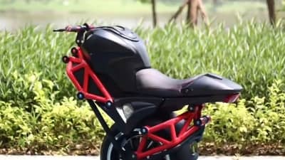 Single Wheel Electric Bike च्या फोटोमध्ये आपल्याला स्टील ट्रेलिस फ्रेमसह फॉक्स फ्यूल टँकला सपोर्ट करणारी एकचाकी इलेक्ट्रिक बाईक पाहायला मिळतेय. या मोटारसायकलच्या टँकचं डिझाईन आणि रेड कलर ट्रेलिस फ्रेम डुकाटी मॉन्स्टरसारखं आहे, ज्यामुळे ही बाईक अधिक आकर्षक दिसतेय.