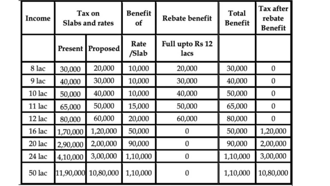 नवीन घोषणेमुळे सर्वच आयकर भरणाऱ्यांची बचत होणार आहे. 12 लाख रुपयांपर्यंत उत्पन्न असणाऱ्यांना थेट 80 हजार रुपयांचा लाभ मिळणार आहे. 12 ते 18 लाख रुपये कमावणाऱ्या व्यक्तीला 70 हजार रुपये फायदा होणार आहे. 24 लाखांपर्यंत कमाई करणाऱ्यांना 1.10 लाख रुपयांची बचत होणार आहे. जी जुन्या नियमानुसार 25 टक्के आहे. तसेच 50 लाख उत्पन्न असणाऱ्यांचेही 1.10 लाख रुपयांची बचत होणार आहे.