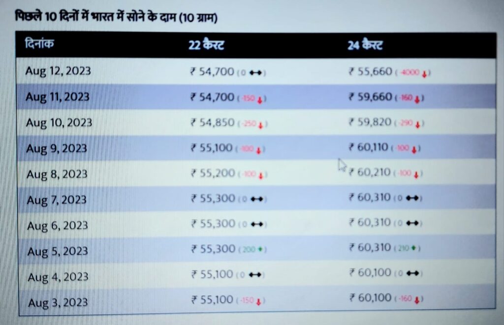 गुडरिटर्न्सनुसार, या आठवड्यात 6,7 ऑगस्ट रोजी मोठी दरवाढ झाली नाही. तर 8 ऑगस्ट रोजी सोन्यात 100 रुपयांची घसरण झाली. 9 ऑगस्ट रोजी पुन्हा 100 रुपयांची स्वस्ताई आली. 10 ऑगस्ट रोजी सोन्याचे भाव 250 रुपयांनी कमी झाले. 11 ऑगस्ट रोजी सोने 150 रुपयांनी स्वस्त झाले. 22 कॅरेट सोने 54,700 रुपये प्रति 10 ग्रॅम तर 24 कॅरेट सोन्याचा भाव 59,660 रुपये प्रति 10 ग्रॅम असा भाव आहे.