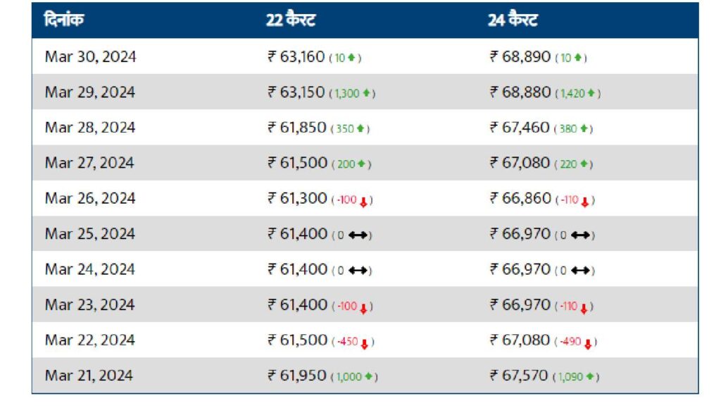 या आठवड्यात 26 मार्चला सोन्यात 100 रुपयांनी घसरण झाली. 27 मार्च रोजी 200 रुपयांनी भाव वधारला. 28 मार्च रोजी सोने 350 रुपयांनी महागले. तर 29 मार्च रोजीनुसार 1300 रुपयांची दरवाढ झाल्याचा दावा करण्यात येत आहे. गुडरिटर्न्सनुसार, आता 22 कॅरेट सोने 63,150 रुपये प्रति 10 ग्रॅम तर 24 कॅरेट सोन्याचा भाव 68,880 रुपये प्रति 10 ग्रॅम आहे.