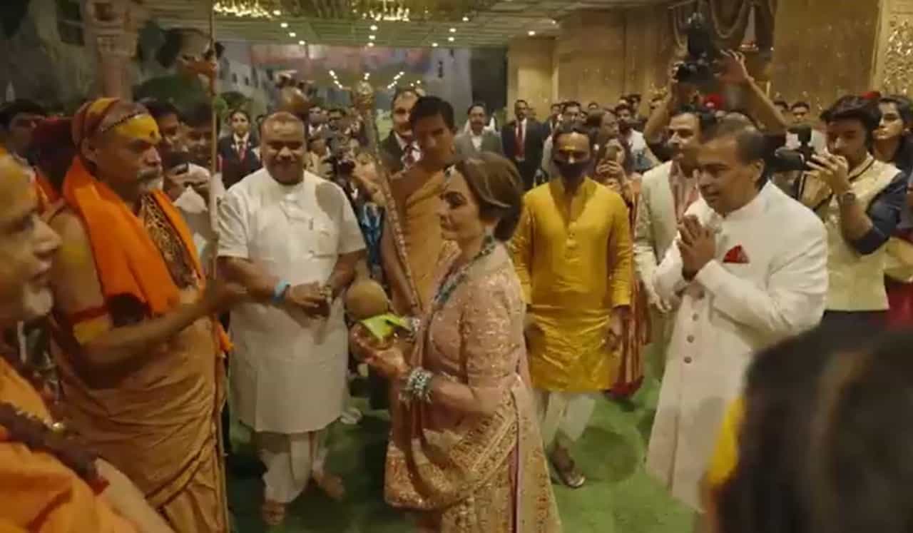 द्वारका पीठाचे शंकराचार्य स्वामी सदानंद सरस्वती आणि ज्योतिर्मठचे शंकराचार्य स्वामी अविमुक्तेश्वरानंद हे अनंत आणि राधिका यांना ‘शुभ आशीर्वाद’ देण्यासाठी पोहोचले होते. मुंबईतील जिओ वर्ल्ड सेंटरमध्ये या कार्यक्रमाचे आयोजन करण्यात आले आहे. अनंत अंबानीचे आई-वडील नीता आणि मुकेश अंबानी यांचे पारंपरिक पद्धतीने त्यांचे स्वागत केले. नीता अंबानी यांनी शंकराचार्यांची आरती करून स्वागत केले. आरतीही वेगळ्या पद्धतीने झाली. नीता अंबानी यांच्या हातात कलश होता, जो एका खास पद्धतीने तयार करण्यात आला होता. नीता अंबानी शंकराचार्यांना आरती दाखवत असताना बाजूला मुकेश अंबानी हात जोडून उभे होते.