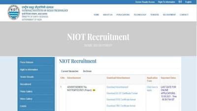 नॅशनल इन्स्टिट्यूट ओसियन टेक्नॉलॉजीनं त्यांच्या वेबसाईटवर यासंदर्भात सविस्तर नोटिफिकेशन जारी केलं आहे. पात्र उमेदवार https://www.niot.res.in/niot1/recruitment.php या वेबसाईटला भेट देऊन अर्ज सादर करु शकतात. या पदांसाठी अर्ज करण्यास 20 ऑगस्टपासून सुरुवात झाली आहे. तर, अर्ज सादर करण्याचा अखेरचा दिनांक 13 सप्टेंबर आहे.