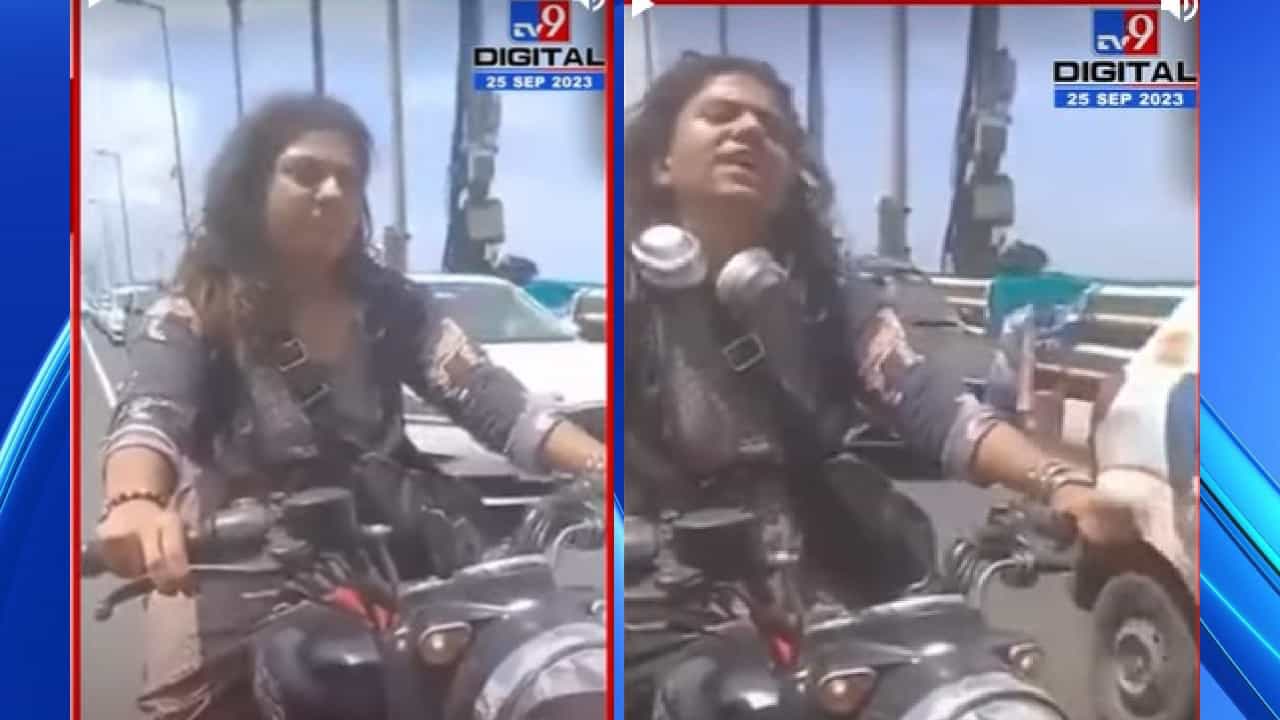 वांद्रे सी-लिंकवर मोटरसायकल चालविण्यास बंदी असतानाही एका महिला बुलेट चालकाने पोलीसांनी अडविताच त्यांना शिवीगाळ केल्याचा व्हिडीओ व्हायरल होत आहे.