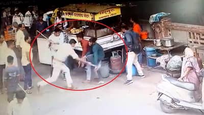 आधी मद्यधुंद टोळक्याची वडा पाव विक्रेत्याला मारहाण, नंतर पोलीसांनी दिला चोप… #nashik #crime #cctv #Police pic.twitter.com/vV2DnhdtF1