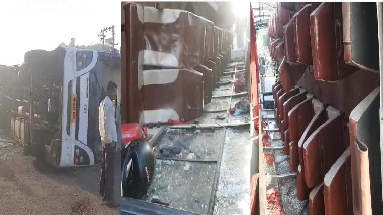 बस पलटल्यानंतर गाडीतील सामानही इतरत्र विखुरलं. तसंच बसच्या खिडक्यांच्या काचांचा चक्काचूर झाल्याचं पाहायला मिळालं.