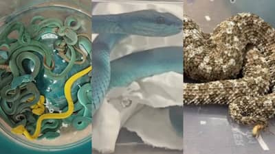 मिळालेल्या माहितीनुसार, छत्रपती शिवाजी महाराज आंतरराष्ट्रीय विमानतळावर एका भारतीय प्रवाशाकडे 47 विषारी साप आणि पाच कासवं आढळून आली. अधिकाऱ्यांना संबंधित प्रवाशाबद्दल संशय आला होता. त्यानंतर त्यांनी त्याला थांबवलं आणि त्याच्या बॅगेची तपासणी केली. या तपासणीदरम्यान त्यांना विषारी साप आणि कासवं आढळून आली. RAW (रेस्क्विंक असोसिएशन फॉर वाइल्ड लाइफ वेलफेअर) पथकाने या साप आणि कासवांच्या प्रजाती ओळखण्यास मदत केल्याचंही अधिकाऱ्यांनी सांगितलं. हे साप आणि कासव वन्यजीव संरक्षण कायद्यांतर्गत पुन्हा त्या देशात परत पाठवले जातील. याप्रकरणी प्रवाशाविरोधात गुन्हा दाखल करण्यात आला असून त्याच्यावर योग्य ती कारवाई केली जात आहे.