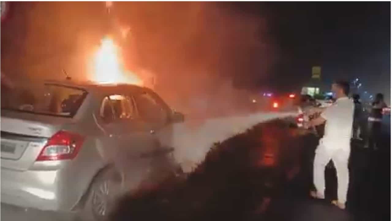 VIDEO | मुंबई-अहमदाबाद हायवेवर गाडी पेटली, प्रवासी बालंबाल बचावले, कार जळून खाक