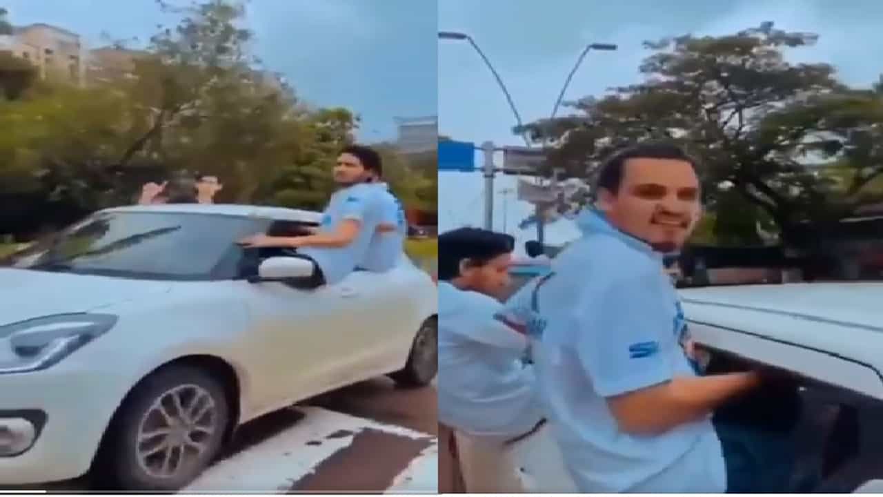 खिडकीच्या काचा खाली करुन त्यावर बसत तीन युवक लटकलेले या व्हिडीओत दिसत आहेत. चालत्या कारमध्ये मुलांनी केलेल्या दंगामस्तीचा व्हिडीओ ट्विटरवर पोस्ट झाल्यानंतर व्हायरल झाला आहे.