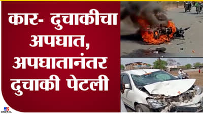 नाशिक : अपघातानंतर गाड्यांना आग लागल्याच्या घटना दिवसेंदिवस वाढत आहेत. चंद्रपुरात (Chandrapur Track Accident News) दोन ट्रकमध्ये झालेल्या अपघातनंतर आग लागून 9 जणांचा मृत्यू झाला होता. ही घटना जाती असतानाचा आता नाशिकमध्येही (Nashik Accident News) भीषण अपघात घडला. बाईक आणि कार (Bike-car accident) यांची एकमेकांना धडक होऊन अपघात झाला. या अपघातामध्ये दुचाकीस्वार जखमी झालाय. त्याला तातडीनं उपचारासाठी रुग्णालयात दाखल करण्यात आलं. मात्र या भीषण अपघातानंतर दुचाकीनं पेट घेतला. बघता बघता ही दुचाकी आगीत जळून पूर्णपणे खाक झाली होती. तर गाडीचंही मोठं नुकसान या अपघातामध्ये झालं. सुदैवानं या अपघातामध्ये कोणतीही जीवितहानी झाली. सध्या जखमी दुचाकी स्वारावर शासकीय रुग्णालयात उपचार सुरु आहेत.