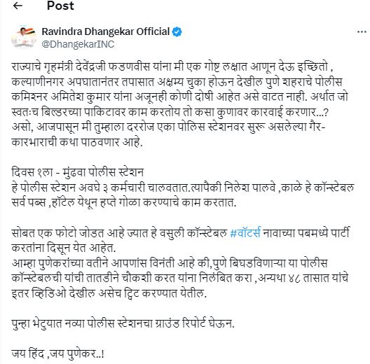 आमदार रवींद्र धंगेकर यांनी पुणे बिघडवणाऱ्या या पोलीस कॉन्स्टेबलची तातडीने चौकशी करावी. त्याला निलंबित करा, अन्यथा ४८ तासांत त्याचे इतर व्हिडिओ देखील असेच ट्विट करण्यात येतील, असे म्हटले आहे.