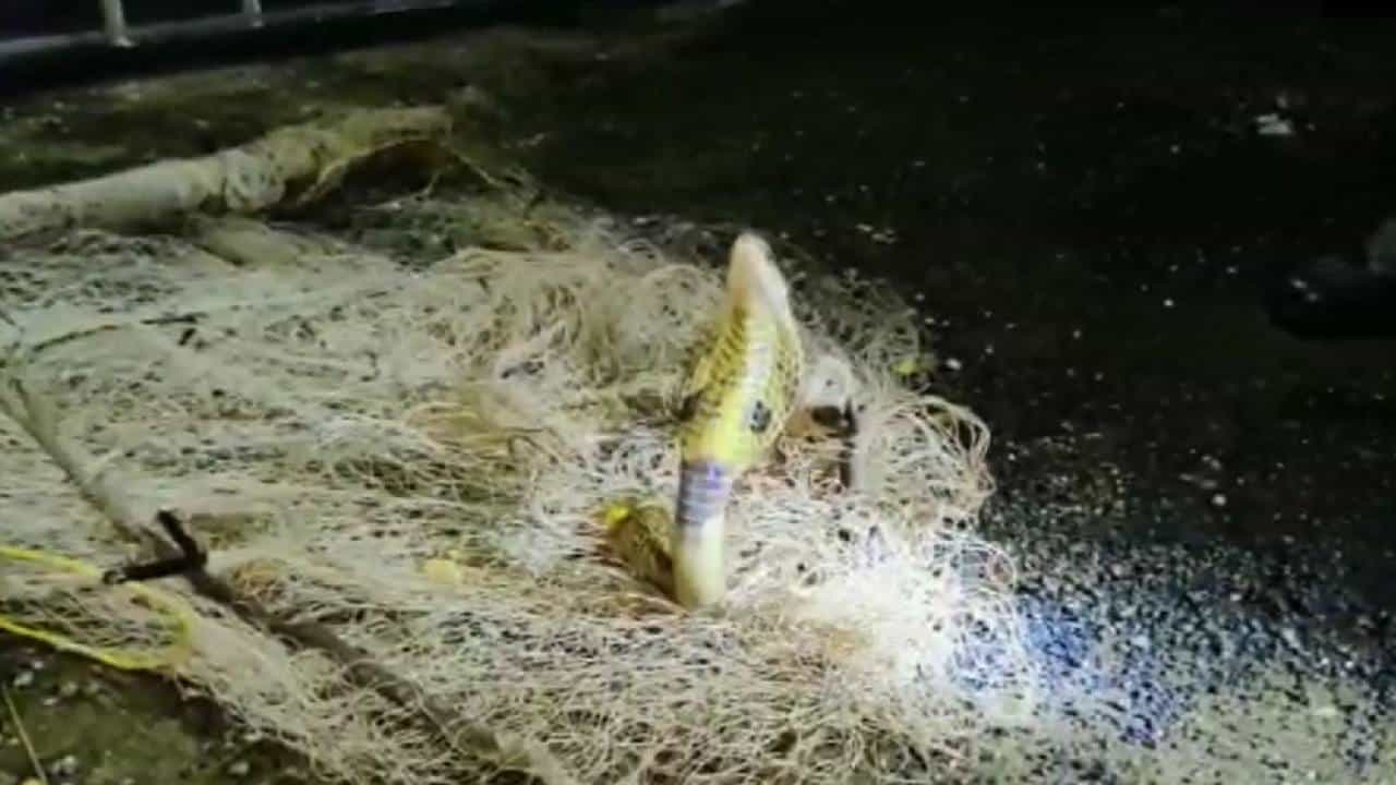 ठाणे : पावसाळा सुरु होताच शेती, जंगलांतील सापांच्या बिळांमध्ये पाणी शिरते. त्यामुळे निवारा आणि भक्ष्य शोधण्यासाठी विषारी-बिन साप (Snake) मानवी वस्तीत शिरल्याच्या घटना महिन्याभरापासून घडत आहेत. विशेष म्हणजे एक विषारी कोब्रा (Cobra) नाग माशांच्या जाळ्यात अडकून पडल्याचे मासेमारी करणाऱ्याला दिसताच एकच गोंधळ उडाला होता. मात्र सर्पमित्रांच्या मदतीने जाळे कापून त्या नागाला जीवदान (Rescued) दिले आहे. सर्पमित्रांना याबाबत तात्काळ माहिती देण्यात आली. त्यानंतर सर्पमित्रांनी या कोब्राची सुटका करत त्याला निसर्गाच्या सानिध्यात सोडले.