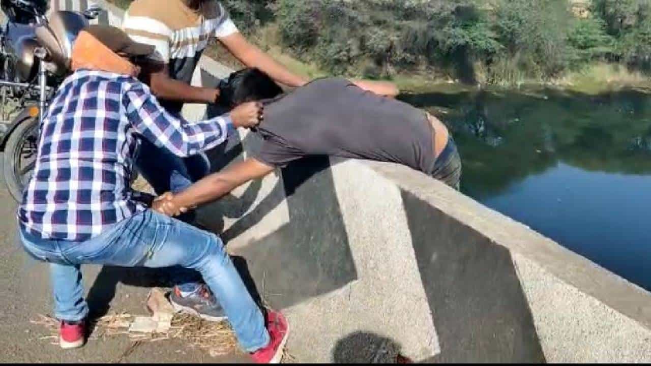 पिंपळगाव बसवंत शहरातील कादवा नदीवरील पुलावरून उडी मारून आत्महत्येच्या तयारीत असलेल्या राकेश आहिरे या युवकामुळे थोडक्यात वाचलाय. याचे प्राण वाचविण्यात स्थानिक तरुणांना यश आले असून व्हायरल झालेल्या व्हिडीओतून ही धक्कादायक घटना समोर आली आहे. व्हिडिओत दिसतंय की हा जीव द्यायला नवीच्या कठड्यावर चढला आहे. मात्र पुलावरून जाणाऱ्या दुचाकीस्वार तरुणांनी दुचाकी पार्क करत क्षणाचाही विलंब न करता या ठिकाणी धाव घेतली. आणि पुलावरून उडी मारण्याच्या तयारीत असलेल्या युवकाचा हात घरून ठेवीत परिसरात आरडाओरड केली. यावेळी इतरही काहीजण मदतीला धावून आल्याचे दिसते. या तरुणांच्या साथीदाराच्या मदतीने आत्महत्या करण्याच्या तयारीत असलेल्या युवकाचे प्राण वाचविण्यास अजय जाधव व नाझीम अत्तर या युवकांना यश आल्याने त्यांचे सर्वस्त्रातून कौतुक होत आहे.