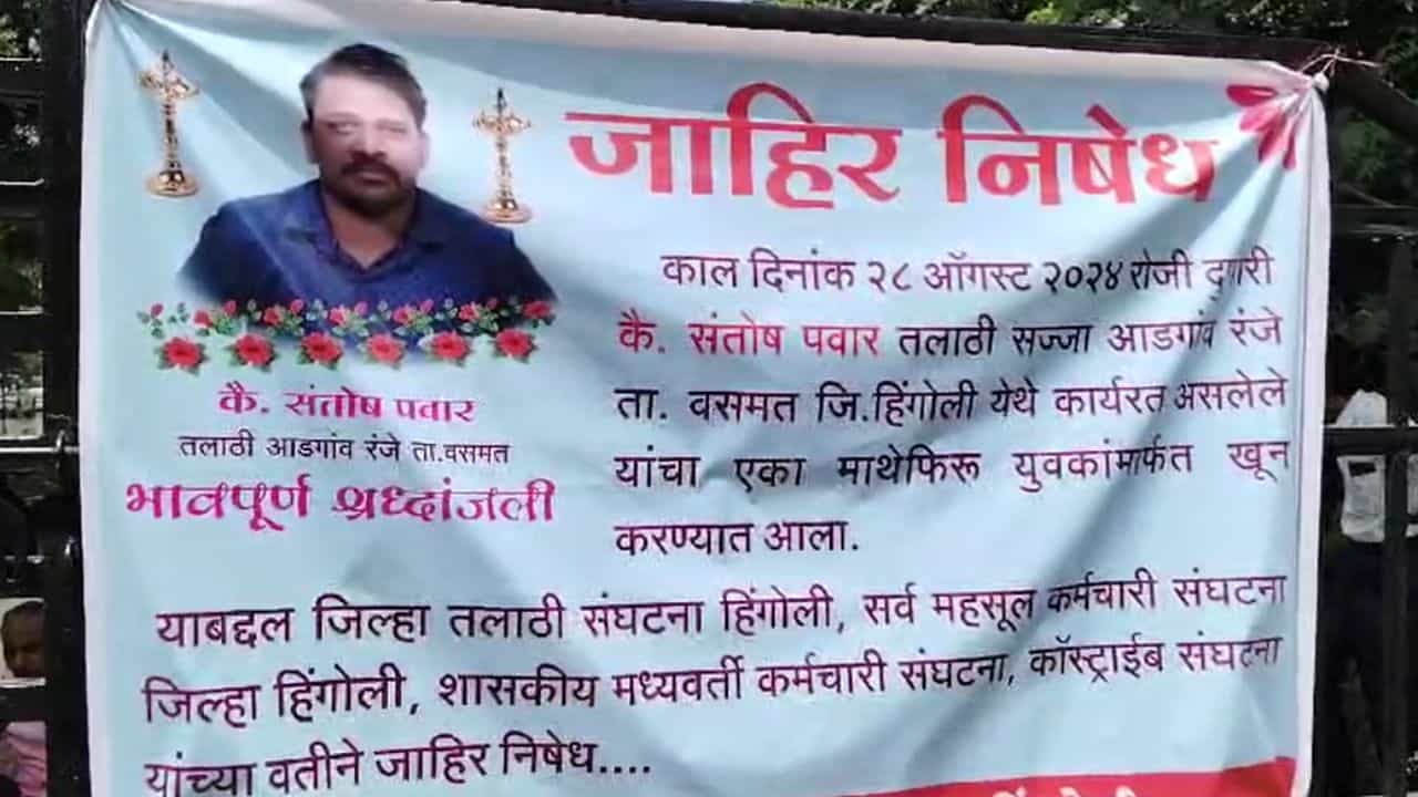 या खुनाचे पडसाद आज राज्यभर पाहायला मिळत आहेत. तलाठी महासंघाच्या वतीने आज राज्यभर काम बंद आंदोलनाची हाक देण्यात आली आहे. या आंदोलनात महसूल विभागातील विविध संघटना सहभागी झाल्या आहेत. हिंगोली जिल्हाधिकारी कार्यालयासमोरही महसूल विभागातील वेगवेगळ्या संघटनांच्या वतीने संतोष पवार यांना श्रद्धांजली अर्पण करून काम बंद आंदोलन सुरू करण्यात आहे.