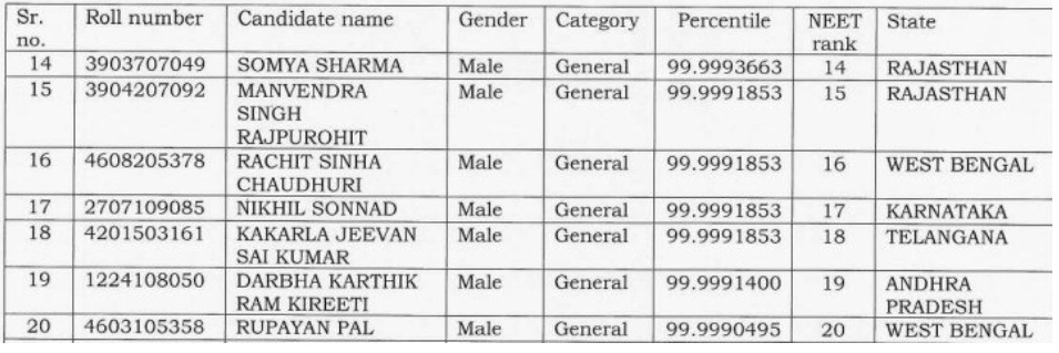 रँक 14 ते 20 च्या दरम्यान राजस्थानचे तीन आणखी विद्यार्थी आले आहेत. त्यात सोम्या शर्मा, मानवेन्द्र सिंह राजपुरोहित यांचा समावेश आहे, पश्चिम बंगालचे रचित सिन्हा चौधुरी आणि रूपायन पाल, कर्नाटकचा निखिल सॉनाड, तेलंगानाच्या काकर्ला जीवन साई कुमार, आणि आंध्र प्रदेशातील दर्भा कार्तिक राम कीरेटी यांनी देखील टॉप 20 मध्ये जागा मिळवली आहे.