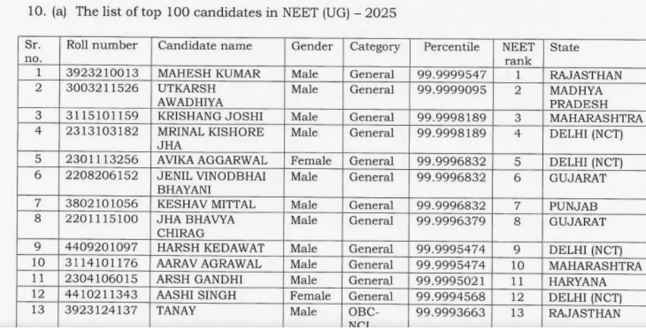 NEET UG 2025 च्या टॉप 20 विद्यार्थ्यांच्या यादीत राजस्थान, दिल्ली (NCT) आणि महाराष्ट्र सारख्या राज्यातील विद्यार्थ्यांनी बाजी मारली आहे.