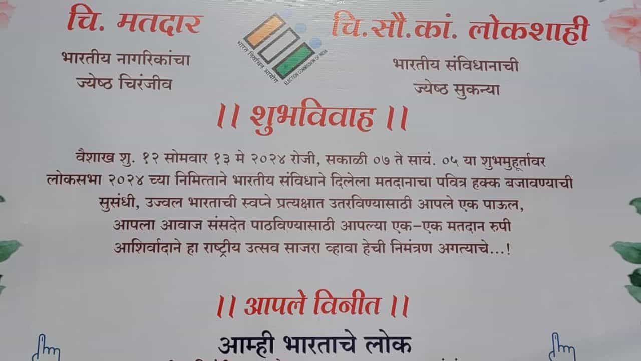 या अनोख्या लग्नाचे निमंत्रण आम्ही भारताचे लोक यांनी दिले आहे. आपले मतदान हाच आमचा आहेर अण् विकसित भारत हेच तुमचे रिटर्न गिफ्ट असणार आहे, असे या पत्रिकेत म्हटले आहे.