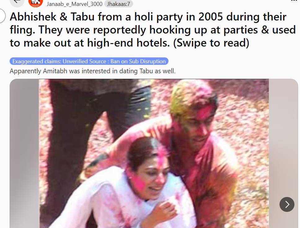 तब्बू आणि अभिषेक बच्चनच्या या व्हायरल फोटोवर सोशल मीडिया यूजर्सही प्रतिक्रिया देत आहेत. एका यूजरने हा फोटो Reddit वर शेअर केला आहे. त्याने हा फोटो शेअर करत लिहिले की, ‘2005 मध्ये होळी पार्टीत अभिषेक व तब्बू. त्यांनी पार्ट्यांमध्ये एकमेकांसोबत वेळ घालवला आणि महागड्या हॉटेलमध्ये मजा केली.’ आता इतर Reddit वापरकर्ते या पोस्टवर प्रतिक्रिया देत आहेत.