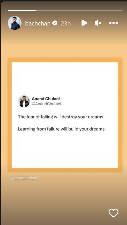 अभिषेक बच्चनने गुरुवारी इंस्टाग्राम स्टोरीवर एक क्रिप्टिक पोस्ट शेअर केली. 25 जानेवारी 2024 रोजी त्याने आनंद चुलानी यांनी लिहिलेल्या ओळी शेअर केल्या. जिथे तो आयुष्यातील अपयशांबद्दल बोलला आहे. ‘अपयशाची भीती तुमची स्वप्ने नष्ट करेल. अपयशातून धडा घेतल्यास तुमची स्वप्ने पूर्ण होतील.’ असे त्या पोस्टमध्ये लिहीण्यात आले आहे. मात्र या पोस्टचा रोख कोणाकडे आहे, हे स्पष्ट झालेले नाही.
