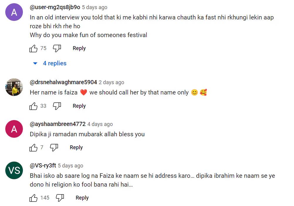 एकाने कमेंट करत लिहिले की, रोजा ठेवला हे ठीक आहे मात्र नवरात्रीमध्ये उपवास पकडणार का? दुसऱ्याने लिहिले की, ही दीपिका कक्कर दोन्ही धर्मांचा मजाक बनवत आहे. तिसऱ्याने लिहिले की, शोमध्ये मुख्य अभिनेत्रीचे पात्र साकारत होती आणि आता बघा काय झाली. लोक जोरदार टीका करताना दीपिका कक्कर हिच्यावर दिसत आहेत.