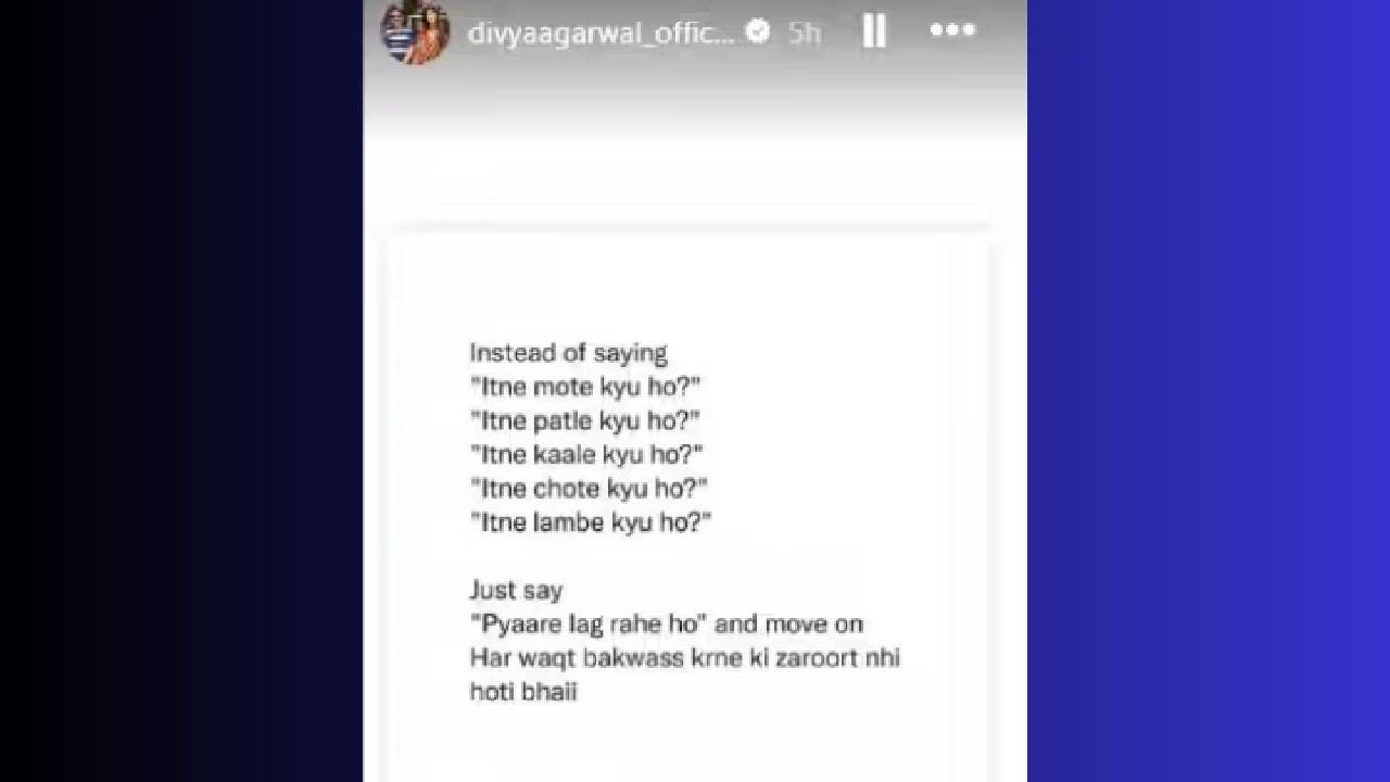दिव्या अग्रवाल हिने पोस्टमध्ये म्हटले की, तुम्ही इतके जाड का आहात, तुम्ही इतके पतले का आहात, इतके जास्त काळे का आहात, इतके छोटे का आहात, इतके उंच का आहात, हे बोला इतके सुंदर का दिसत आहात, प्रत्येक वेळीच बकवास करण्याची अजिबातच गरज नसते भाई..असेही दिव्या अग्रवाल हिने म्हटले आहे.
