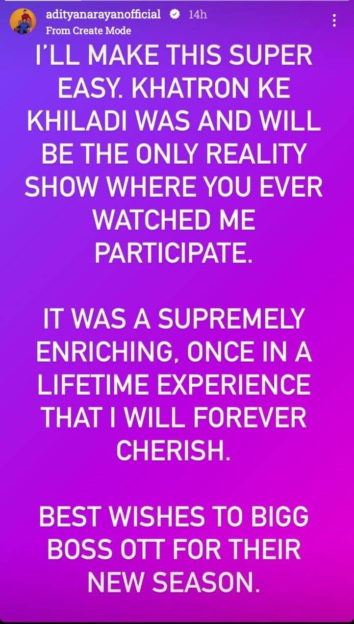 सोशल मीडियाद्वारे आदित्य नारायणने ‘बिग बॉस ओटीटी 2’ च्या एंट्रीसंदर्भात घोषणा केली आहे. आपण या शोमध्ये सहभागी होणार नाही, असे आदित्यने स्पष्ट केले आहे. अभिनेता व गायक असलेल्या आदित्य म्हणाला की, खतरों के खिलाडी हाच त्याचा पहिला आणि शेवटचा रिॲलिटी शो आहे. ‘आपण एकदाच आयुष्यभराचा अनुभव घेतला आहे, आणि तो उत्तम होता ‘, असेही आदित्यने नमूद केले आहे. त्याच्या या वक्तव्यावरून एक गोष्ट तर निश्चितपणे स्पष्ट होते की, आदित्य बिग बॉस ओटीटीमध्ये सहभागी होणार नाहीये.