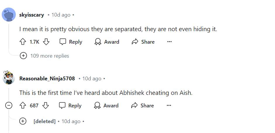 एक रेडिड युजरने केलेल्या दाव्यानुसार, अभिषेक बच्चन याने ऐश्वर्याची फसवणूक केली आहे, त्यामुळेच त्यांच्यात काहीच ठीक नाही. बिग बी अर्थात अमिताभ बच्चन यांच्या वाढदिवसाच्या दिवशी केबीसीमध्ये एक व्हिडीओ दाखवण्यात आला. त्यामध्ये पत्नी जया बच्चन, मुलगी श्वेता बच्चन नंदा, मुलगा अभिषेक बच्चन, नातू अगस्त्य नंदा आणि नात नव्या नवेली नंदा या सर्वांनी अमिताभ बच्चन यांना शुभेच्छा दिल्या. त्यामध्ये त्यांची नात आराध्याचेही फोटो दिसले. पण त्या व्हिडीओत ऐश्वर्या राय कुठेच दिसली नाही. त्यामुळे पुन्हा एकदा अभिषेक आणि ऐश्वर्याच्या घटस्फोटाच्या चर्चांना उधाण आलं. त्या व्हिडीओवरूनच सगळं स्पष्ट झाल्याचं ‘रेडिट’ युजर्सचं म्हणणं आहे, आणि त्यानंतरच अनेकांनी अभिषेक बच्चनला ट्रोल करण्यास सुरूवात केली. अभिषेक-ऐश्वर्याच्या नात्यासाठी एक अभिनेत्री जबाबदार असल्याची चर्चा सुरू झाली.
