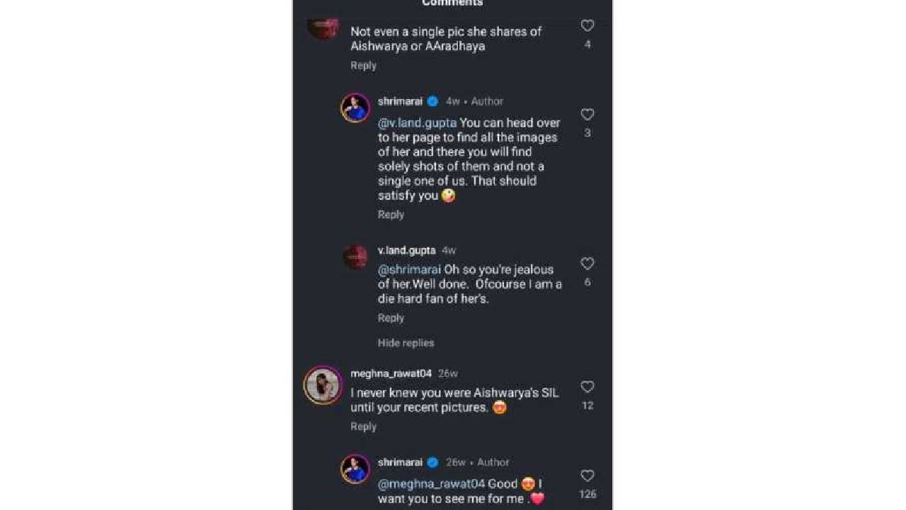 तिने थेट त्या युजरला ऐश्वर्याच्या सोशल मीडिया पेजवर जाण्याचा सल्ला दिला. ट्रोलरला उत्तर देताना श्रीमाने लिहिलं, ‘तुम्ही तिच्या पेजवर जाऊन तिचे फोटो पाहू शकता. तिथे तिने फक्त तिचेच फोटो पोस्ट केले आहेत. त्यात मी कुठेच नाही. कदाचित ही बाब तुम्हाला संतुष्ट करू शकेल,’ श्रीमाच्या या उत्तरावर संबंधित युजरनेही प्रत्युत्तर देत म्हटलं, ‘ओह.. म्हणजे याचा अर्थ तू तिच्यावर जळतेस. खूप छान, मी तर तिची खूप मोठी फॅन आहे.’ श्रीमानेही या वादातून माघार घेतली नाही. ‘मला तर माहितच नव्हतं की तू ऐश्वर्या रायची वहिनी आहेस’, अशी कमेंट करणाऱ्या दुसऱ्या युजरला श्रीमाने उत्तर दिलं, ‘चांगली गोष्ट आहे. माझ्या स्वत:च्या अस्तित्वासाठी तुम्ही माझ्याकडे पहावं असं मलाही वाटतं.’