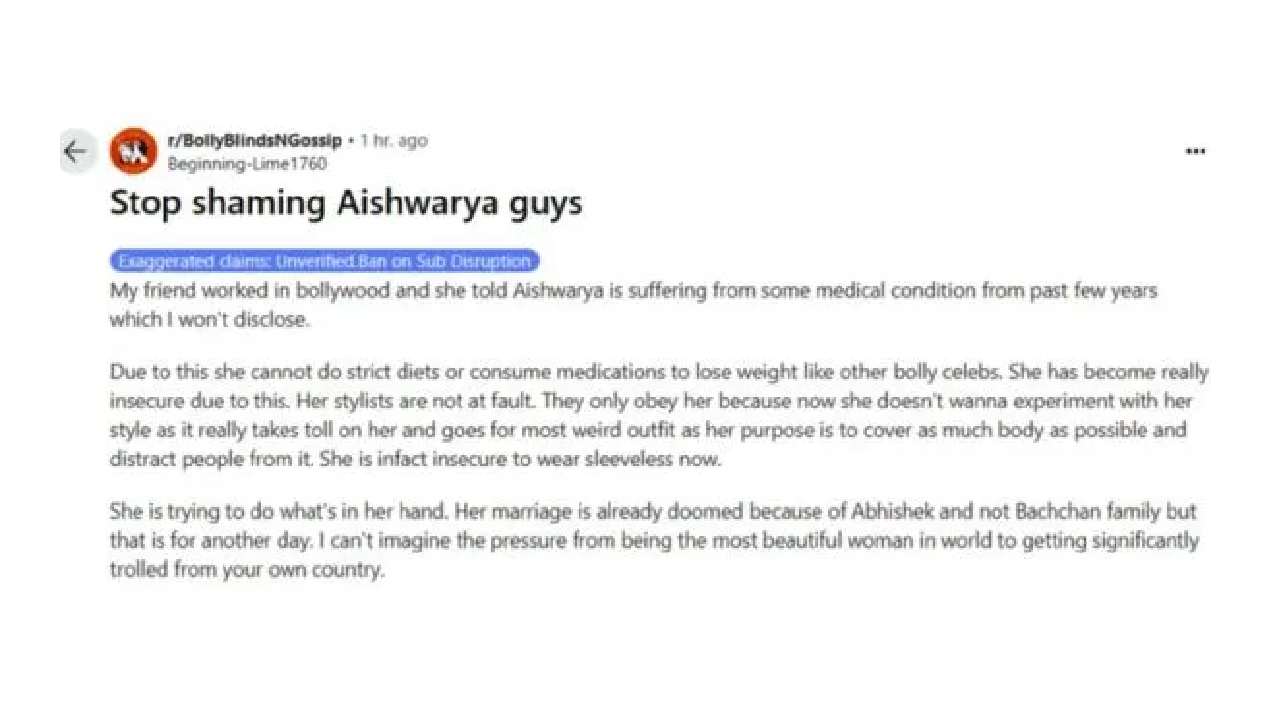 ऐश्वर्याला डाएट करण्याती, जिमला जाण्याची खूप गरज आहे, असे सल्ले नेटकरी देऊ लागले. ऐश्वर्याने कधीच या ट्रोलिंगवर कोणतीही प्रतिक्रिया दिली नाही. मात्र ‘रेडिट’ या सोशल मीडिया प्लॅटफॉर्मवरील एका युजरने तिच्या आरोग्याविषयी धक्कादायक दावा केला आहे. ‘रेडिट’ युजरने लिहिलेली ही पोस्ट सध्या तुफान व्हायरल होत आहे. ऐश्वर्याला आरोग्याच्या काही समस्या असल्याचा दावा या पोस्टमध्ये करण्यात आला आहे.