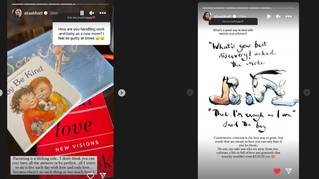 यावेळी आलियाला सोशल मीडियावर किंवा इतर प्लॅटफॉर्मवर पसरवल्या जाणाऱ्या नकारात्मक आणि टीकाटिप्पणींचा सामना कसा करतेस असाही प्रश्न एका युजरने विचारला. त्यावर तिने एक प्रचलित कथा पोस्ट केली. ‘द बॉय, द मोल, द फॉक्स अँड द हॉर्स’ या प्रसिद्ध पुस्तकातील एक ओळ पोस्ट करत तिने सारांश सांगण्याचा प्रयत्न केला. या कथेनुसार चिचुंद्रीसारखा दिसणारा एक प्राणी प्रश्न विचारतो की, ‘तुझा सर्वोत्तम शोध कोणता?’ त्यावर उत्तर देताना मुलगा म्हणतो, ‘मी जसा आहे तसाच पुरेसा आहे.’
