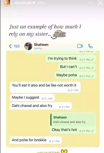 आलिया आता एका मुलीची आई झाली आहे, तरी देखील अभिनेत्री कायम तिच्या लहान बहिणीवर अवलंबून असते. व्हॉट्सॲप चॅटमध्ये दोघी पदार्थांबद्दल बोलताना दिसत आहेत. शाहीन, आलिया हिला सांगत आहे की, तिने काय खाल्ल पाहिजे…