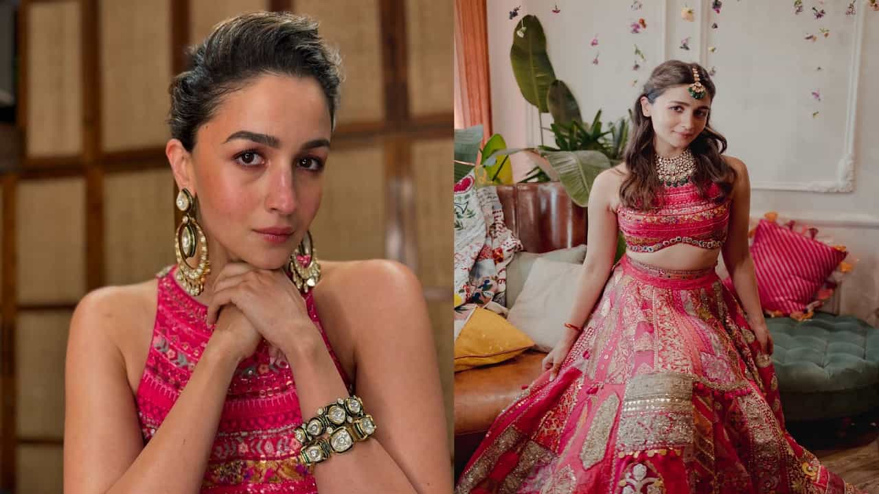 आलियाने एप्रिल 2022 मध्ये मनीष मल्होत्राने डिझाइन केलेल्या तिच्या मेहंदी समारंभासाठी हा गुलाबी लेहेंगा घातला होता. त्यात 180 कापडाचे पॅचेस वापरले होते. काश्मिरी आणि चिकनकारी धाग्याचे काम असलेले हे लेहेंगा पूर्ण करण्यासाठी 3000 तास लागले. आलियाने हा सुंदर लेहेंगा क्रॉप केलेल्या चोळीसोबत जोडला. लेहेंग्यावर जरी आणि सिक्विन वर्कसह सुंदर भरतकामाचे पॅचेस आहेत. चोळी खऱ्या सोन्या-चांदीच्या भरतकामाने आणि कोरा फुलांनी सजवलेली आहे.