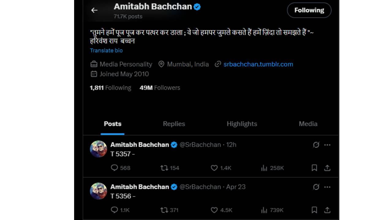 अमिताभ बच्चन यांनी ही पोस्ट फक्त त्यांच्या ट्विटर अकाऊंटवरच नाही तर फेसबुक आणि ब्लॉगवरही केली आहे. 22 एप्रिलला रात्री उशिरा त्यांनी ट्विटर अकाऊंटवर फक्त T 5356 असं लिहिलं होतं. आता 24 एप्रिल रोजीसुद्धा त्यांनी ट्विटरवर फक्त T 5357 हा आकडा लिहिला आहे. त्याचप्रमाणे ब्लॉगमध्येही DAY 6277 असा आकडा लिहिला आहे. यावरून नेटकऱ्यांनी विविध प्रतिक्रिया दिल्या आहेत. ‘जर T 5357 इतकं लिहिलंच आहे तर, बाकी ट्विटसुद्धा लिहायचं होतं’, असं एकाने लिहिलं. तर ‘पहलगाम हल्ल्यावर संपूर्ण देश व्यक्त होत असताना, हळहळ व्यक्त करताना तुम्ही किमान दोन शब्द लिहू शकत नाही का’, असा सवाल दुसऱ्याने केला. ‘हे नकली महानायक आणि नकली शहनशाह आहेत’, अशीही टीका नेटकऱ्यांनी केली. काही नेटकऱ्यांनी अमिताभ बच्चन यांची बाजूसुद्धा घेतली आहे. ‘कधी कधी काय बोलावं हे सुचत नाही, इतके आपण सुन्न होतो’, असं एकाने लिहिलंय. तर ‘त्यांनी मौन बाळगूनच मोठी प्रतिक्रिया दिली आहे’, असं दुसऱ्या युजरने म्हटलंय.