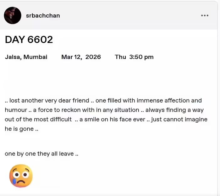 अमिताभ बच्चन यांनी 12 मार्च रोजी संध्याकाळी 3.50 वाजता त्यांच्या ब्लॉगमध्ये लिहिलं… ‘आणखी एका प्रिय मित्राला गमावलं आहे… एक अशी व्यक्ती जो प्रंचड स्नेह आणि विनोदबुद्धीने संपन्न होता… कोणत्याही परिस्थितीत त्याने कधीच दुःख व्यक्त केलं नाही. फक्त परिस्थितीतून मार्ग काढत राहिला… त्याच्या चेहऱ्यावर फक्त आनंद दिसायचा… विश्वास होत नाही की, आता तो आमच्यात नाही… एक एक करून सगळे सोडून जात आहेत…’, या पोस्टसोबत अमिताभ बच्चन यांना रडणारा इमोजी पोस्ट केला… अमिताभ बच्चन यांच्या पोस्टवर अनेकांनी कमेंट करत त्यांना आधार दिला.