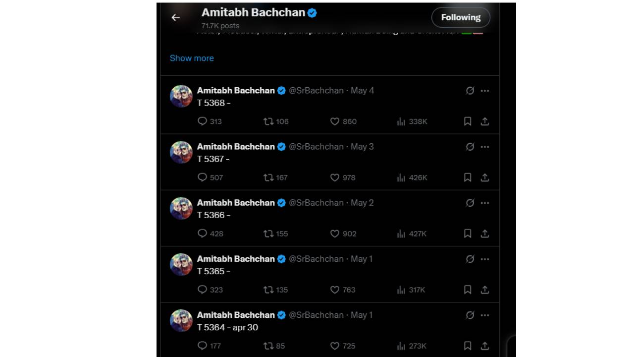 22 एप्रिल रोजी त्यांचं शेवटचं असं ट्विट होतं, ज्यामध्ये मजकूर लिहिलेला होता. त्यानंतर ते दररोज फक्त पोस्टमध्ये ट्विटचा आकडा लिहित आहेत. त्यापुढे ते काहीच म्हणत नाहीयेत. गेल्या तेरा दिवसांपासून बिग बी असेच ट्विट रोज करत आहेत. त्यामुळे त्यांना नेमकं काय बोलायचं आहे, असा प्रश्न अनेकांना पडला आहे. पहलगाम हल्ल्याच्या 14 दिवसांनी भारताने ऑपरेशन सिंदूर राबवत पाकिस्तानमधील दहशतवादी तळ उद्ध्वस्त केले. त्यानंतर पाकिस्तानकडूनही भारतावर हवाई हल्ले सुरू आहेत. देशभरात तणावाचं वातावरण असताना, भारत-पाकिस्तान या दोन्ही देशांमध्ये युद्धजन्य परिस्थिती असताना बिग बी मात्र एक्स अकाऊंटवर फक्त ब्लँक पोस्ट लिहित आहेत.