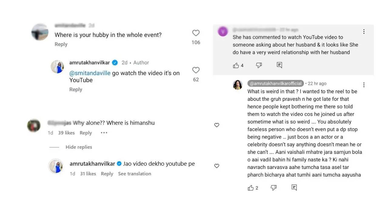 अभिनेत्री अमृता खानविलकरने नुकताच तिच्या नवीन घरात गृहप्रवेश केला. या गृहप्रवेशाचा खास व्हिडीओ तिने सोशल मीडियावर पोस्ट केला आहे. या व्हिडीओमध्ये अमृतासोबत तिची आई, बहीण आणि वडील दिसून आले. मात्र पती हिमांशू मल्होत्रा दिसला नाही. यावरून एका नेटकऱ्याने तिला प्रश्न विचारला असता अमृताने ‘युट्यूब’वर जाऊन व्हिडीओ पाहण्यास सांगितलं. त्यानंतरही आणखी एका युजरने अमृताच्या पतीवरून कमेंट केली. ‘पतीबद्दल विचारणाऱ्याला तिने युट्यूबवर जाऊन व्हिडीओ पाहण्यास सांगितलं. तिचं खरंच तिच्या पतीसोबत विचित्र नातं असल्याचं पहायला मिळतंय’, असं संबंधित युजरने लिहिलं. त्यावर आता अमृताने सडेतोड उत्तर दिलं आहे.
