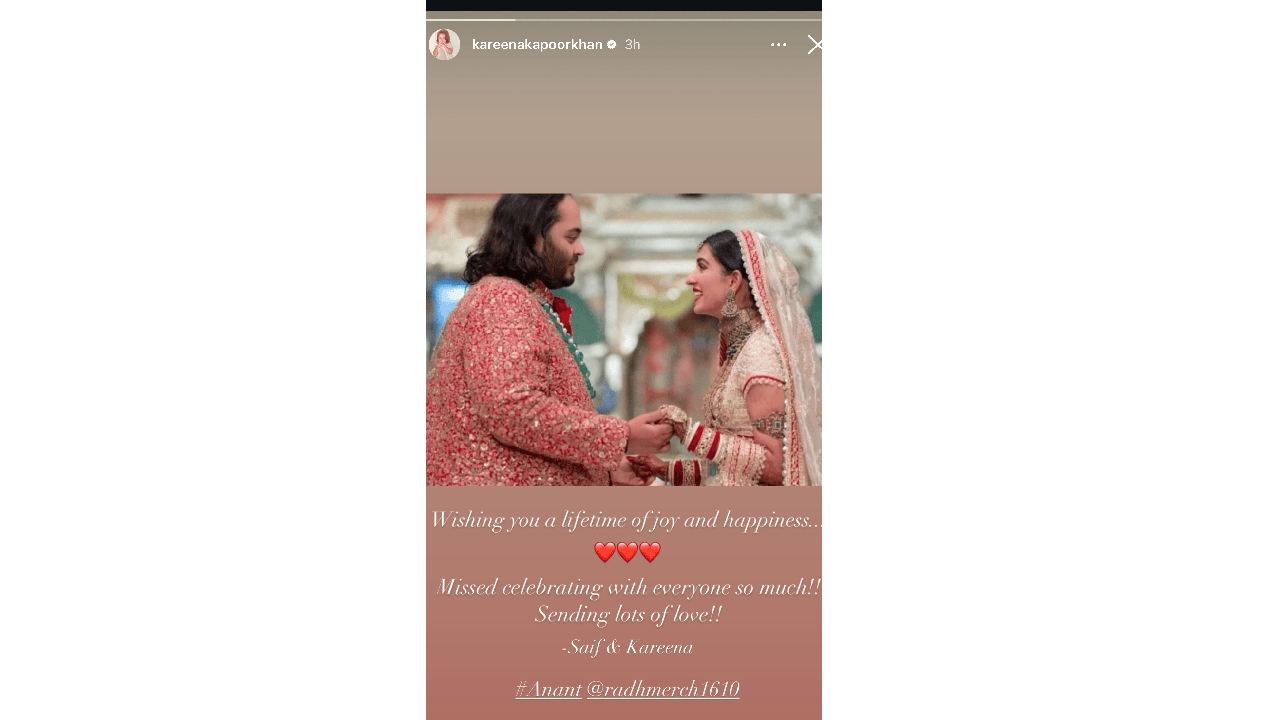 देशातील सर्वांत मोठे व्यावसायिक मुकेश अंबानी यांचा मुलगा अनंत अंबानीने शुक्रवारी रात्री राधिका मर्चंटशी धूमधडाक्यात लग्न केलं. या लग्नाला देश-विदेशातील मान्यवर उपस्थित होते. राजकीय, क्रीडा, चित्रपट आणि इतर अनेक क्षेत्रातील नामांकित व्यक्ती अनंत-राधिकाच्या लग्नसोहळ्याला पोहोचले होते. अंबानींच्या प्रत्येक कार्यक्रमात बॉलिवूड कलाकारांची मांदियाळी पहायला मिळते. लग्नातही अनेक कलाकार उपस्थित होते. मात्र या सर्वांत अभिनेत्री करीना कपूर कुठेच दिसली नाही. करीना आणि तिचा पती सैफ अली खान हे दोघं अंबानींच्या कार्यक्रमाला गैरहजर होते. आता करीनाने सोशल मीडियावर याविषयी पोस्ट लिहिली आहे. या पोस्टमध्ये तिने अनंत आणि राधिकाला शुभेच्छासुद्धा दिल्या आहेत.
