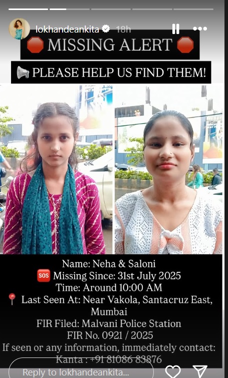 अंकिता लोखंडे हिने मुख्यमंत्री देवेंद्र फडणवीस, उपमुख्यमंत्री एकनाथ शिंदे आणि इतरांसह मुंबई पोलिसांना मदतीचं आवाहन केलं आहे. सांगायचं झालं तर, घरातली मोलकरणीची मुलगी आणि तिची मैत्रिण एकत्र गायब झाल्यामुळे खळबळ माजली आहे. अद्याप दोन्ही मुलींबद्दल कोणतीही माहिती समोर आलेली नाही. पोलीस मुलींचा शोध घेत आहे.