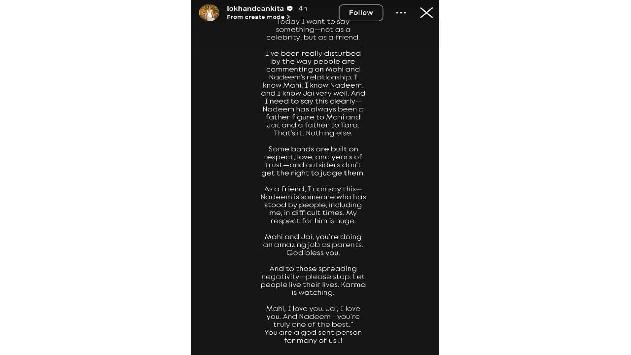 ‘मला आज काही बोलायचंय, एक सेलिब्रिटी म्हणून नाही तर एक मैत्रीण म्हणून.. लोक ज्याप्रकारे माही आणि नदीम यांच्या नात्याबद्दल कमेंट करत आहेत, ते पाहून मी खूपच अस्वस्थ झाले. मी माहीला ओळखते, मी नदीम यांना ओळखते आणि मी जयलासुद्धा चांगल्या प्रकारे ओळखते. त्यामुळे मला हे स्पष्ट करायचं आहे की नदीम हे माही आणि जय यांच्यासाठी वडिलांसमान आहेत. तर तारासाठी ते वडीलच आहेत. एवढंच, यापलीकडे काहीच नाही. काही नाती आदर, प्रेम आणि वर्षानुवर्षांच्या विश्वासाने बांधलेली असतात. बाहेरच्यांना याबद्दल मतं बनवण्याचा कोणताच अधिकार नाही. एक मैत्रीण म्हणून मी हे सांगू शकते नदीमने कायम लोकांच्या कठीण काळात साथ दिली आहे आणि त्यात माझाही समावेश आहे. माझ्या मनात त्यांच्याविषयी प्रचंड आदर आहे’, असं अंकिताने स्पष्ट केलं.