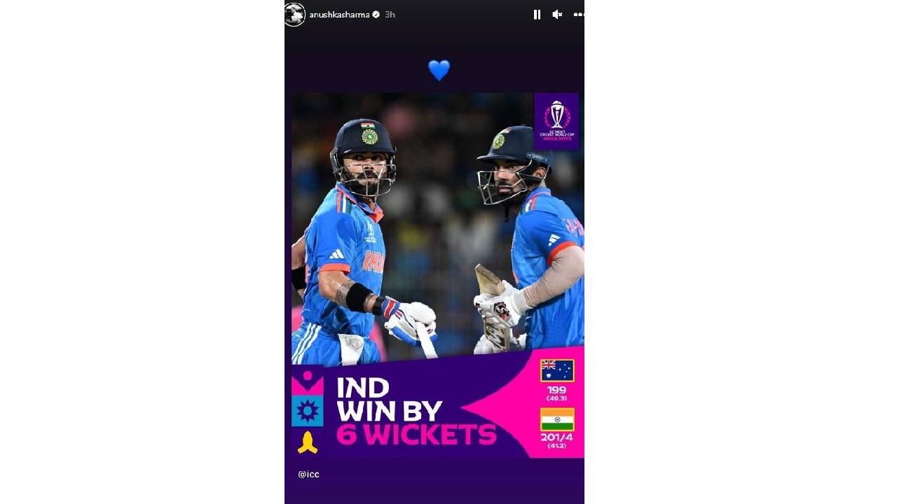 अनुष्का शर्माने तिच्या इंस्टाग्राम स्टोरीवर आयसीसीची एक पोस्ट शेअर केली आहे. आयसीसीच्या या पोस्टमध्ये विराट कोहलीसोबत केएल राहुल पाहायला मिळतोय. या दोघांचा फोटो शेअर करत अनुष्काने निळ्या रंगाचा हृदयाचा इमोजी त्यावर पोस्ट केला आहे. अनुष्कासोबतच सोशल मीडियावर असंख्य क्रिकेटप्रेमी विराट कोहली आणि टीम इंडियाला शुभेच्छा देत आहेत.