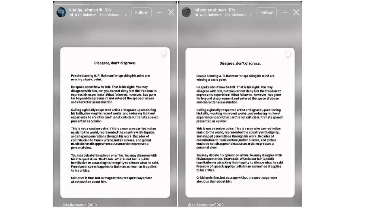 कैलाश यांनी पोस्टमध्ये पुढे लिहिलंय, ‘हा काही सर्वसामान्य आवाज नाही. ही अशी व्यक्ती आहे, ज्यांनी भारतीय संगीताला जगभरात नेलं आणि देशाचं प्रतिष्ठेनं प्रतिनिधित्व केलं. आपल्या कामाद्वारे त्यांनी पिढ्या घडवल्या आहेत. एखाद्या कलाकाराने त्यांचं वैयक्तिक मत व्यक्त केलं म्हणून तमिळ संस्कृती, भारतीय चित्रपट आणि जागतिक संगीतातील त्यांचं दशकांचं योगदान संपत नाही. तुम्ही चित्रपटाबद्दलच्या त्यांच्या मतावर वाद घालू शकता. तुम्ही त्यांच्या वक्तव्याशी असहमत असू शकता. हे सर्व ठीक आहे. पण सार्वजनिकरित्या त्यांचा अपमान करणं किंवा त्यांच्या प्रामाणिकपणावर शंका घेणं हे चुकीचं आहे. अभिव्यक्ती स्वातंत्र्य जितकं रेहमान यांना लागू आहे, तितकंच ते त्यांच्या टीकाकारांनाही लागू आहे.’ ए. आर. रेहमान यांच्या मुलगी खतिजा आणि रहिमा यांनी ही पोस्ट त्यांच्या इन्स्टा स्टोरीमध्ये शेअर करत टाळ्या वाजवण्याचा इमोजी पोस्ट केला आहे.