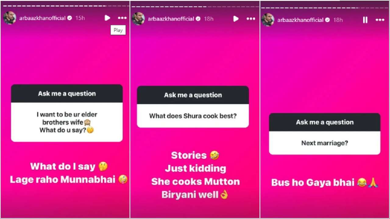 ‘आस्क मी एनिथिंग’ सेशनमध्ये एका युजरने अरबाजसमोर त्याचा भाऊ सलमान खानशी लग्न करण्याची इच्छा व्यक्त केली. ‘मला तुमच्या मोठ्या भावाची बायको व्हायचंय. यावर तुम्ही काय म्हणाल’, असा प्रश्न एका युजरने अरबाजला विचारला होता. त्यावर अरबाजने उत्तर दिलं, ‘मी काय म्हणू? लगे रहो मुन्नाभाई.’ यासोबतच त्याने हसण्याचा इमोजी पोस्ट केला. आणखी एका युजरने अरबाजच्या तिसऱ्या लग्नाविषयी विचारलं. ‘पुढील लग्न’, असा प्रश्न विचारणाऱ्याला उत्तर देताना अरबाजने लिहिलं, ‘बस हो गया भाई’ (पुरे झालं आता भावा) यासोबत तो हसण्याचा आणि हात जोडल्याचा इमोजी पोस्ट करतो.