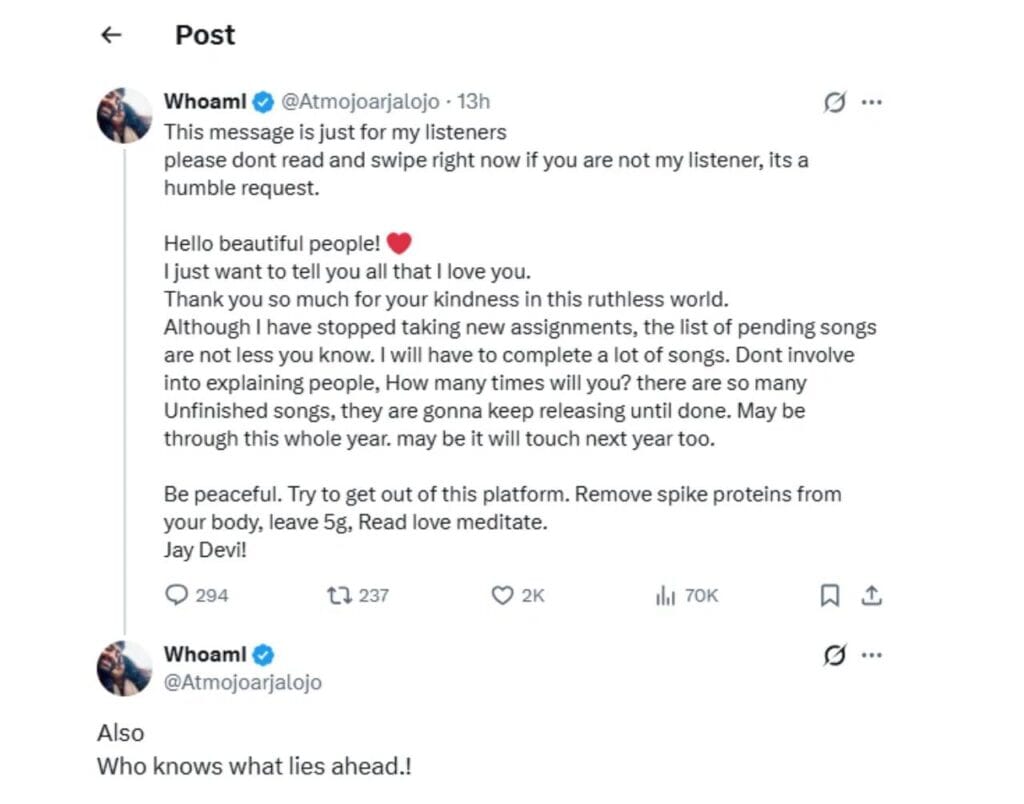 पुढे तो म्हणाला, “लोकांना पटवून देण्यात वेळ वाया घालवू नका, तुम्ही किती वेळा समजावून सांगाल ? अशी अनेक अपूर्ण गाणी आहेत जी पूर्ण होईपर्यंत रिलीज होत राहतील. कदाचित वर्षभर. कदाचित पुढच्या वर्षीही. शांत राहा. या व्यासपीठापासून दूर राहण्याचा प्रयत्न करा. तुमच्या शरीरातून स्पाइक प्रोटीन काढून टाका, 5 ग्रॅम सोडून द्या, वाचा, प्रेम करा आणि मेडिटेशन करा.” असा संपूर्ण मेसेज त्याने चाहत्यांसाठी लिहीला आहे.
