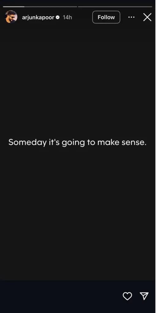अर्जुन कपूर बऱ्याच दिवसांपासून त्याच्या इंस्टाग्राम हँडलवर सतत गूढ पोस्ट शेअर करत असतो. अर्जुन कपूरने पुन्हा एकदा लक्ष वेधून घेणारी पोस्ट शेअर केली आहे. त्याच्या इंस्टाग्राम स्टोरीवर त्याने लिहिले आहे की, ‘कधीतरी हे समजेल.’ आता तो इथे कशाबद्दल बोलत आहे? हे फक्त अर्जुनलाच माहिती आहे, पण त्यानंतर लगेच मलायकाने देखील एक पोस्ट केली ज्यामुळे असे वाटत आहे की दोघेही एकमेकांना काहीतरी सांगण्याचा प्रयत्न करत आहेत.
