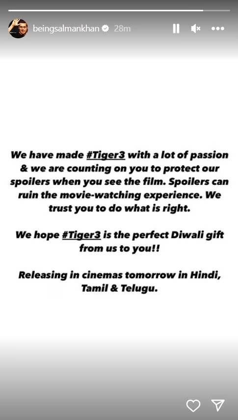 आता सलमान खान याने पोस्ट शेअर करत म्हटले की, आम्ही टायगर 3 चित्रपट मोठ्या मेहनतीने बनवला आहे. जेव्हा तुम्ही चित्रपट पहाल तेव्हा स्पॉयलरपासून वाचवण्याठी आम्ही तुमच्यावर नक्कीच विश्वास करत आहोत. स्पॉयलर चित्रपट पाहण्याचा अनुभव खराब करू शकतात. जे योग्य आहे ते तुम्ही कराल असा आमचा विश्वास आहे. नक्कीच हा विश्वास आहे की, टायगर 3 ही तुमच्यासाठी आमच्याकडून दिवाळीची सर्वोत्तम भेट ठरेल.