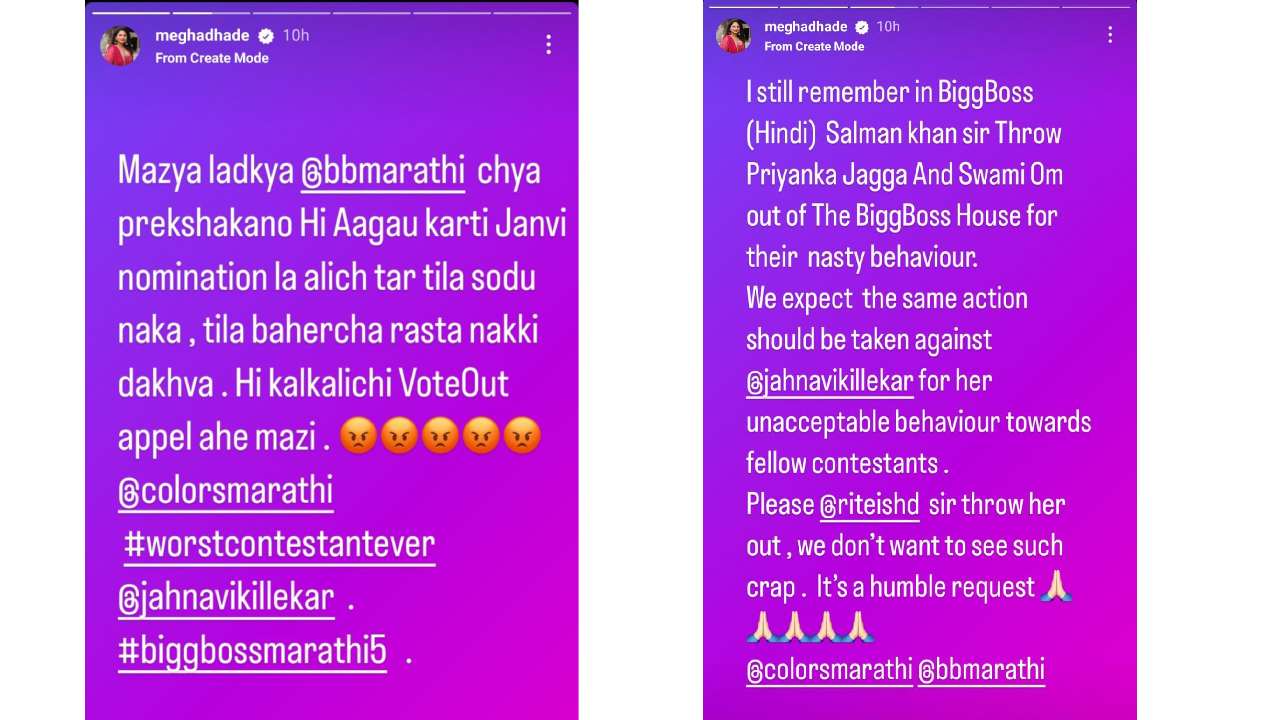‘माझ्या लाडक्या बिग बॉस मराठीच्या प्रेक्षकांनो, ही आगाऊ कार्टी जान्हवी नॉमिनेशनला आलीच तर तिला सोडू नका. तिला बाहेरचा रस्ता नक्की दाखवा, ही माझी कळकळीची विनंती आहे. बिग बॉस मराठीची सर्वांत वाईट स्पर्धक, जान्हवी किल्लेकर’, असं तिने एका पोस्टमध्ये म्हटलंय. तर दुसऱ्या पोस्टमध्ये तिने सूत्रसंचालक रितेश देशमुखकडे खास मागणी केली आहे. ‘मला अजूनही आठवतंय की हिंदी बिग बॉसमध्ये सलमान खान सरांनी प्रियांका जग्गा आणि स्वामी ओम यांना चुकीच्या वागणुकीबद्दल घरातून बाहेर काढलं होतं. आता आम्हाला रितेश देशमुख सरांकडूनही ही अपेक्षा आहे. तुम्ही याबद्दल नक्की काहीतरी बोला. जान्हवी किल्लेकरचं असं वागणं अत्यंत चुकीचं आहे. रितेश सर, प्लीज तिला बाहेर हाकलून द्या. आम्हाला असे लोक घरात नको आहेत,’ असं तिने लिहिलंय.