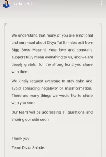 दिव्या हिच्या टीमकडून पोस्ट शेअर करण्यात आली आहे. “आम्ही समजू शकतो की, ‘बिग बॉस मराठी’ शोमधून दिव्या शिंदेची एक्झिट झाल्यामुळे अनेक लोक भावुक झालेत आणि अनेकांना धक्का देखील बसला आहे. पण तुमचं प्रेम आणि पाठिंबा आमच्यासाठी सर्वकाही आहे. आम्ही तुम्हा सर्वांचे मनापासून आभार मानतो. पण सर्वांना एक विनंती करतो, कृपया कोणीही या घटनेबाबत चुकीची माहिती किंवा नकारात्मकता पसरवू नका. तुम्हाला खूप काही सांगायचं आहे. आम्ही लवकरच सर्व प्रश्नांची उत्तरं देत आमची बाजूही मांडू”