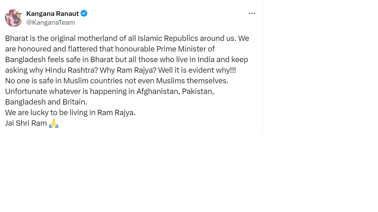 पुढे कंगना म्हणाल्या, ‘पण प्रत्येक भारतीय विचार आहे की हिंदू राष्ट्र का? राम राज्य का? आता याठिकाणी एक गोष्ट स्पष्ट झाली आहे आणि ती म्हणजे मुस्लीम देशांमध्ये कोणी सुरक्षित नाही…. स्वतः मुसमान देखील त्यांच्या देशात सुरक्षित नाहीत…अफगाणिस्तान, पाकिस्तान, बांगलादेश आणि ब्रिटनमध्ये जे काही घडत आहे ते दुर्दैवी आहे. आपण भाग्यवान आहोत की आपण रामराज्यात राहात आहोत…’ सध्या कंगना यांची पोस्ट तुफान व्हायरल होत आहे.